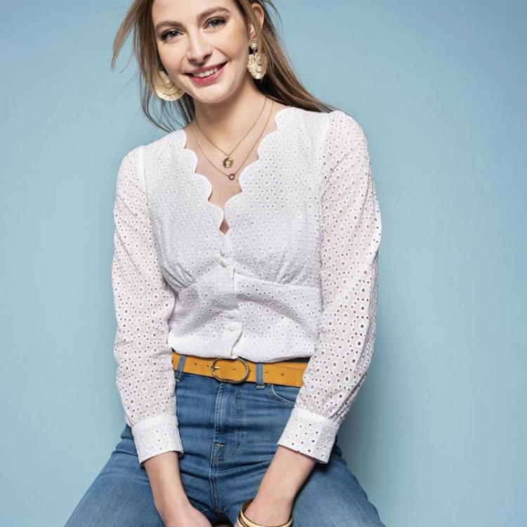 Tissu du modèle : Nous avons choisi, pour ce chemisier en broderie anglaise, un tissu en 100 % coton.