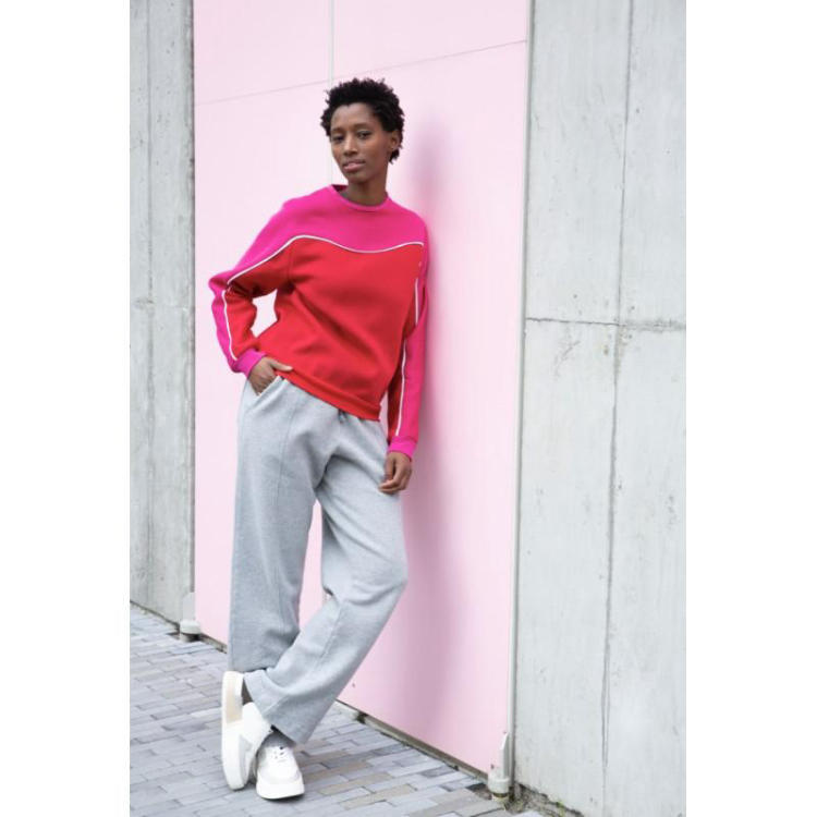 Conseil tissu : Nous avons utilisé un tissu à sweat-shirt mi-lourd avec un envers doux pour les deux couleurs. Vous ne pouvez utiliser que les tissus extensibles pour ce modèle, afin de pouvoir passer votre tête dans l'encolure.