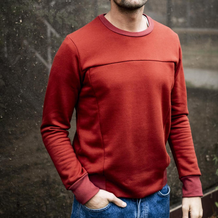 Réalisez le sweat Calvin en tissu à sweat-shirt, tissu à bouclette ou néoprène. Les bords encolure, manchette et ourlet sont coupés en tissu bord-côte. Le tissu côtelé est extensible mais garde sa forme.