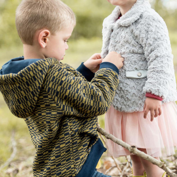 Conseil tissus : LMV a opté pour un tissu tricoté chaud en laine, avec un imprimé coloré. Ce modèle convient particulièrement aux tricots lourds et tissus pour sweat-shirt.