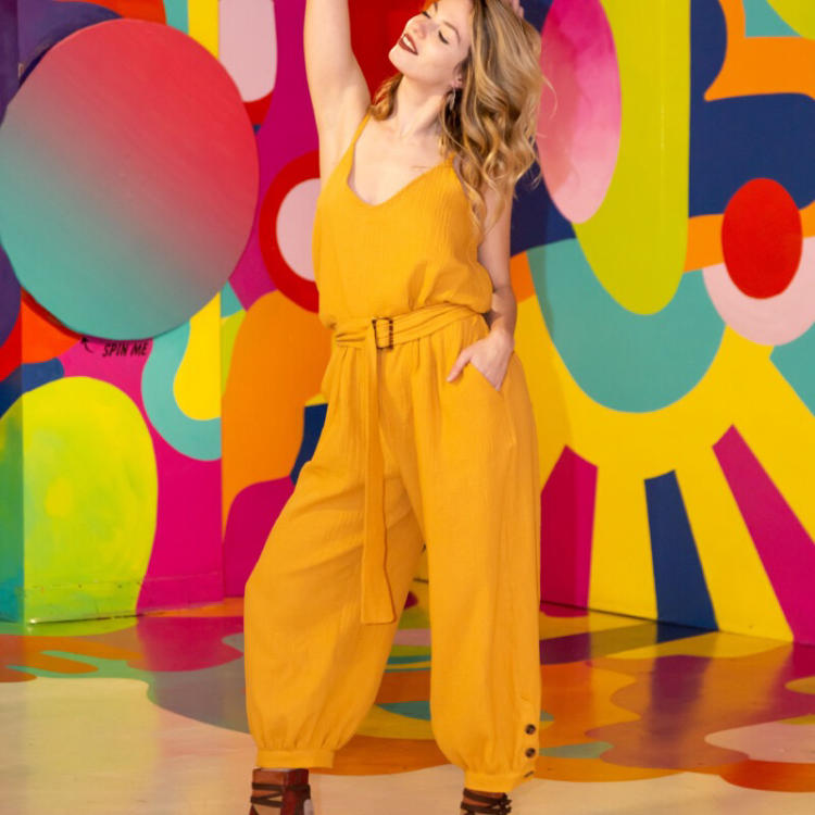 Cette combinaison regorge de style et de sophistication tout en dégageant une ambiance très bohème-chic ; ceinturée pour créer une taille cintrée parfaite, mais ample et confortable avec une superbe jambe large qui se rassemble en un revers à la cheville.