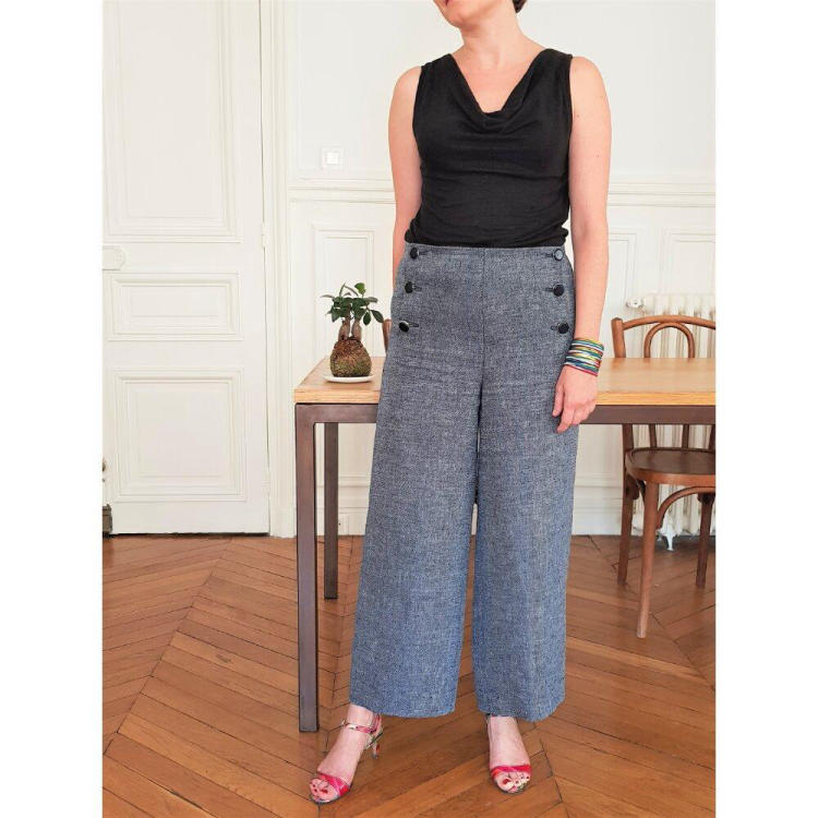 Fonctionne bien avec un tissu un peu raide qui se tient bien pour donner de la tenue au pantalon. Pour l’été on peut utiliser un lin épais, une toile de coton.