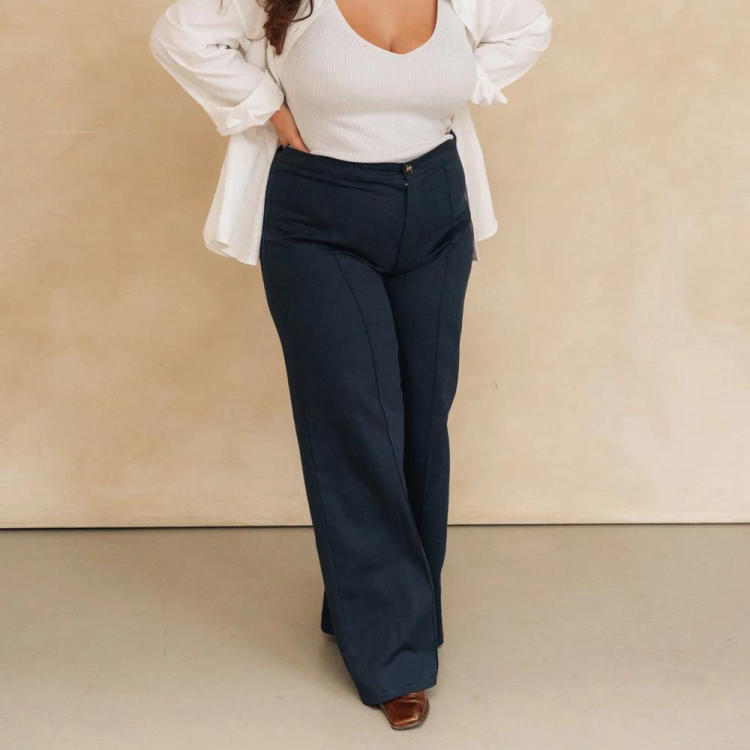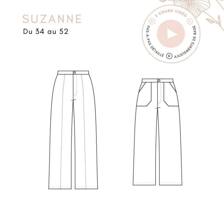 Suzanne est un pantalon taille haute à la jambe ample, aux proportions et aux finitions parfaites, qui peut être réalisé en longueur classique ou 7/8ème et propose plusieurs variantes. Pour le coudre sans difficulté on vous accompagne avec deux vidéos (lien à retrouver sur le livret) : un pas-à-pas détaillé + un mini-cours dédié aux ajustements de base d'un pantalon.