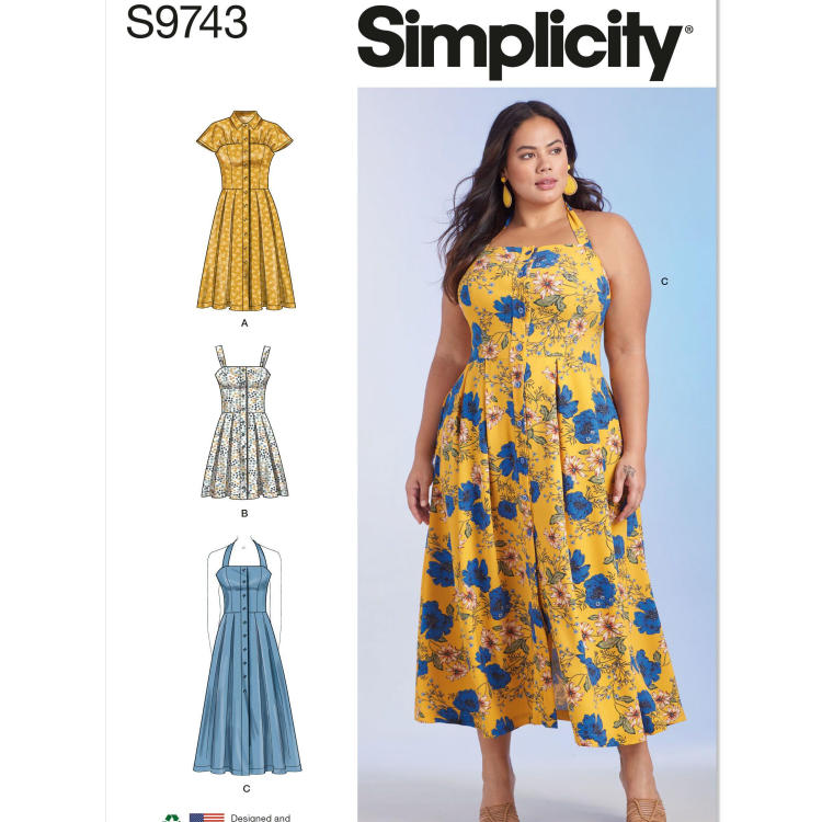 Le patron de couture Simplicity 9743 pour femmes propose des robes boutonnées sur le devant, disponibles en trois longueurs, avec des coutures princesse, des plis inversés et des poches latérales. La version A présente un col, un empiècement et des manches à capuchon, tandis que la version B est une robe courte à bretelles. La version C est une robe halter se nouant dans le dos. Ce patron est classé comme ayant une difficulté de couture moyenne, ce qui le rend idéal pour ceux qui ont une expérience intermédiaire en couture et cherchent à ajouter des pièces polyvalentes à leur garde-robe de printemps. Correspondances tailles: 48 (EUR 46) 50 (EUR 48) 52 (EUR 50) 54 (EUR 52) 56 (EUR 54)